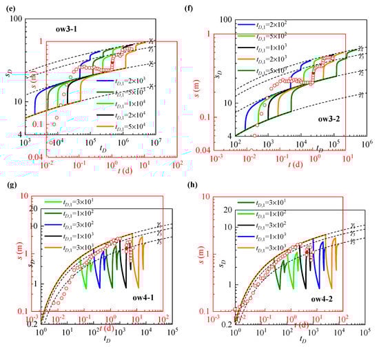 Matching the scattered points of pumping time (t) versus measured drawdown (s) with the type curves (tD versus sD) depending on different t1,D values. (a,b) Observation wells 1 and 2 for the first pumping test; (c,d) Observation wells 1 and 2 for the second pumping test; (e,f) Observation wells 1 and 2 for the third pumping test; (g,h) Observation wells 1 and 2 for the fourth pumping test. Red circle and red solid dot denote the measured drawdown and matching point selected for the parameter estimation, respectively.