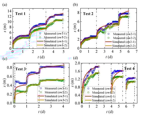 According to Doherty [], selecting a reasonable initial parameter value is crucial when using PEST with the Levenberg–Marquardt algorithm. The initial value should be close to the optimized value to enhance the optimization efficiency. In this study, we used the hydraulic parameters obtained through the type curve method as the initial guess for automatic estimation by coupling the analytical solution, i.e., Equation (5), with PEST. Figure 8 displays a comparison between the simulated and observed drawdowns for each pumping test, and the estimated parameters are summarized in Table 2.