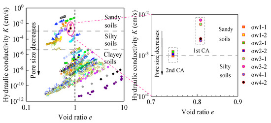 - Ren, X.; Zhao, Y.; Deng, Q.; Li, D.; Wang, D. A relation of hydraulic conductivity-Void ratio for soils based on Kozeny-carman equation. Eng. Geol. 2016, 213, 89–97. [Google Scholar] [CrossRef]