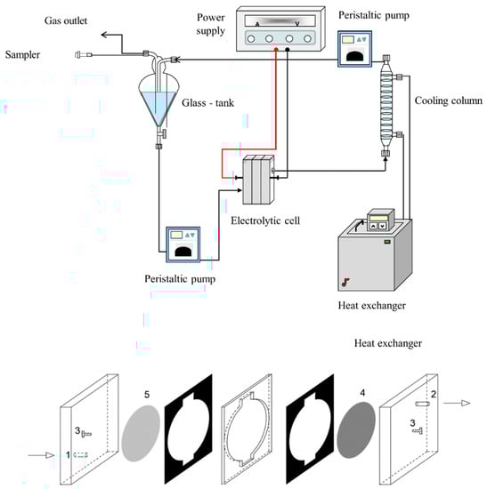 Electrochemical oxidation runs were carried out in a circular single-cell reactor consisting of two circular electrodes with a geometric area of 78 cm2, with an electrode gap of 9 mm. Boron-doped diamond material (BDD) and a stainless-steel electrode (AISI 304) were used as anode and cathode, respectively. The BDD electrode was supplied by CSEM (Switzerland). Before experiments, the electrodes were polarised and cleaned with a 10 mM Na2SO4 solution at a current density (j) of 20 mA·cm−2 for 15 min. The electrolysis was carried out using the equipment detailed and shown in Figure 1.
