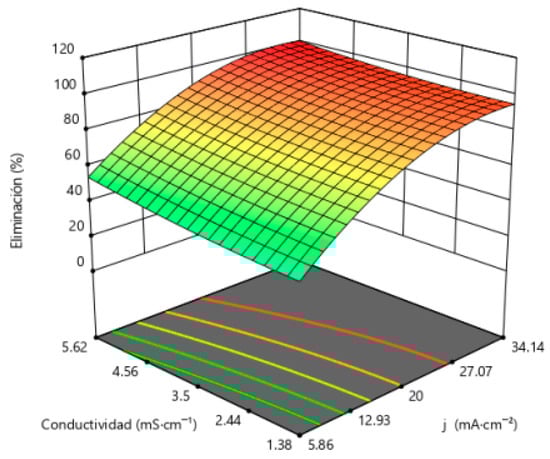 Figure 2 shows the response surface and level curves corresponding to ACP removal at 60 min of reaction time. These surfaces are convex within the study region. The percentage of neonicotinoids removal increases with current density (j). However, the curvature has an asymptotic tendency (less influential at longer treatment times), whereas conductivity’s influence is positive but moderate.