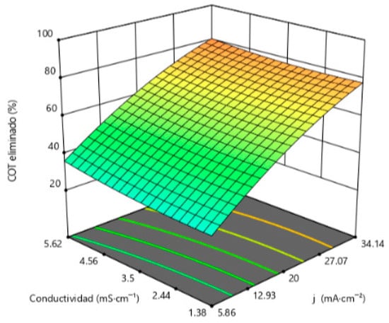 In this section, the results are analyzed, taking as the target variable the removal of total organic carbon (TOC) expressed as a percentage (% ECOT) after 120 min of reaction time. As shown in Table 4, higher percentages of TOC removal were obtained when the current density increased. According to other authors, higher mineralization was reached under a higher current density []; however, the influence of the conductivity was softly positive in this study range (54.8–62.5%).