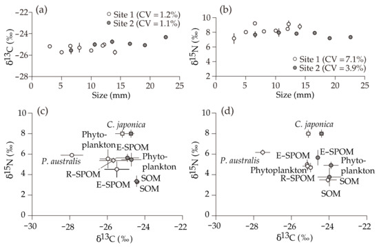 - Doi, H.; Matsumasa, M.; Toya, T.; Satoh, N.; Mizota, C.; Maki, Y.; Kikuchi, E. Spatial shifts in food sources for macrozoobenthos in an estuarine ecosystem: Carbon and nitrogen stable isotope analyses. Estuar. Coast. Shelf Sci. 2005, 64, 316–322. [Google Scholar] [CrossRef]