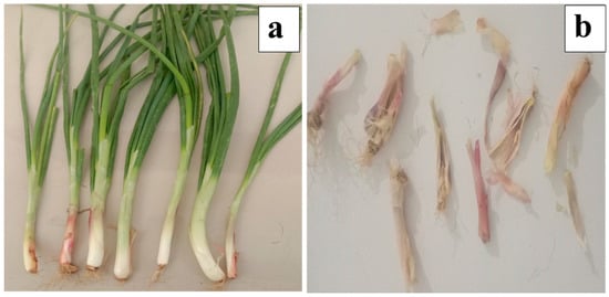 (a) Photograph of scallion’s onion and (b) dried peel from scallions.