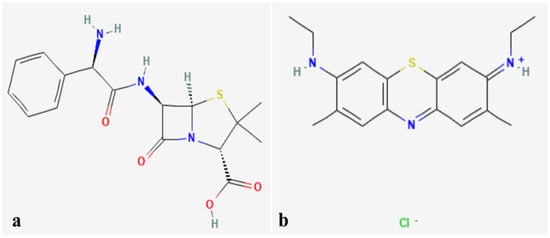 Molecular structure of (a) ampicillin and (b) methylene blue.