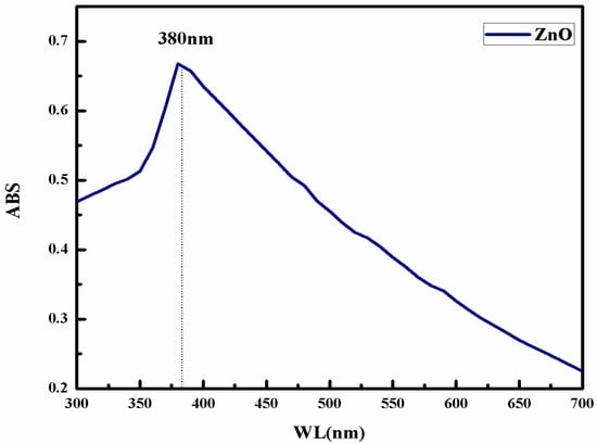 UV-Vis is the basic technique for the preliminary investigation of the synthesized ZnONPs. Figure 4 shows a UV-Vis spectrum of ZnONPs synthesized by scallion peel extract. From the figure, it is clear that the UV has a peak at 380 nm for the synthesized ZnONPs. While in general, the peak for ZnONPs may fall in the range of 355–380 nm depending on the size and other features of the material. An earlier a team led by Shahmari also reported a band at 357 nm, which was attributed to the intrinsic band gap of Zn-O absorption [40]. A team led by Talam also obtained a UV-Vis band at 355 nm for the synthesized ZnONPs [41]. Iqbal and their team obtained a UV-Vis band at 399 nm, synthesized from L. nobilis leaf extract [13]. Fakhari and their team also obtained a band at 385 nm for the synthesis of ZnONPs [13]. Numerous investigators have also reported similar spectra in the range of 355–380 nm for ZnONPs, for instance Khan and their team [42,43,44,45].
