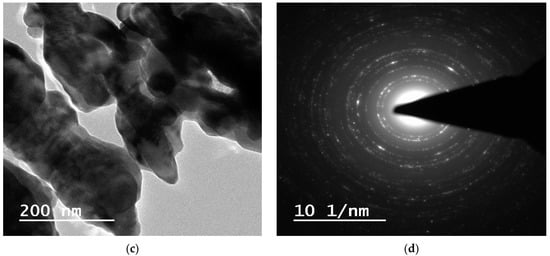 While Figure 5c depicts the TEM image of synthesized ZnONPs at a 200 nm scale, which shows that there are two types of particles, i.e., one is spherical shaped whose size is below 200 nm (40–100 nm), while a few are more than 200 nm and are rod-shaped. The smaller and spherical particles are more dominant than the large irregular rod-shaped particles. The image also shows the aggregation of a few small spherical-shaped particles, whose reason is the calcination of the ZnONPs at a high temperature. Figure 5d shows the scattering area electron diffraction (SAED) pattern, which confirms that the obtained ZnONPs are crystalline in nature. Iqbal and their team reported ZnONPs of size ~26 nm from the leaf extracts of Elaeagnus angustifolia L. [12]. Khan et al., 2019 also observed similar results for the chemically synthesized ZnONPs where the investigators reported different morphology of ZnONPs by using a different type of Zinc precursor [45].