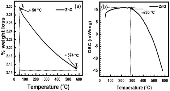 The thermal characters of ZnONPs were examined by the TGA, depicted in Figure 8a. The scallion peel mediated synthesized ZnONPs displayed a weight loss (reaction interval area) between ≈50 °C (initial temperature ≈ Ti) and 574 °C (final temperature ≈ Tf) due to the elimination of physically adsorbed water and the breakdown of organic/hydroxide components [50]. However, the TGA graph showed a descending trend in weight loss up to ≈574 °C may be due to the physically adsorbed organic molecules, while before ≈50 °C, there is no significant peak regarding weight-loss features. Rambabu and their group also observed the thermal stability of DP-ZnO-NPs with <10 wt% loss up to 700 °C, by using DSC/TG analysis [51]. The ZnONPs were of 30 nm size synthesized by Phoenix dactylifera waste. There is no significant variation in weight loss peaks in the TGA graph after ≈574 °C for as prepared ZnO as it is not functionalized with different chemical components [52]. The synthesized ZnO has its crystalline hexagonal geometry (confirmed by XRD), which is often considered a chemically stable phase. However, it is studied that the lightweight organic substances are absorbed onto the stable ZnO surfaces. Therefore, the mass drop curve is clearly obtained by the organic degradation/decompositions while the ZnONPs remained stable with their lattice orientations, and hence, the mass drop does not start at 100% [53]. Figure 8b shows the DSC curve of the synthesized ZnONPs, which revealed endothermic peaks at around 285 °C. The broad peak at around 285 °C is probably due to the loss of chemically adsorbed volatile organic molecules and the formation of ZnONPs [54,55].