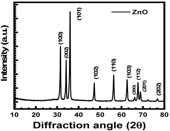 The crystallinity and crystallite size of the ZnONPs were studied by using XRD analysis and the XRD profile is shown in Figure 9. The XRD characteristics peaks for the synthesized ZnO crystal particles are located at 2θ = 31.50°, 34.01°, 36.07°, 47.01°, 56.34°, 62.67°, 66.01°, 67.51°, 69.22°, and 76.91° correspond to the crystallographic planes of (100), (002), (101), (102), (110), (103), (200), (112), (201), and (202), respectively.