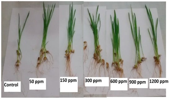 Here, ZnONPs were synthesized by peel extract of scallions onion, which was further used as a micronutrient for the wheat plant. ZnONPs of the following ppm solution were prepared: 50, 150, 300, 600, 900, and 1200 ppm, respectively, of ZnONPs were prepared. The wheat seeds were purchased from a local vendor, then it was thoroughly washed with ddw at least 2–3 times and kept at RT. The procedure for studying phytotoxicity on the wheat plant was similar to the previous studies reported by Modi et al., where the phytotoxicity on the wheat plant was observed but the synthesis of ZnONPs was varied out by using peels of onion collected from the vegetable market [11].