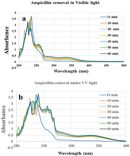 UV−Vis absorbance spectra of ampicillin antibiotic from simulated water under (a) visible light and (b) UV light with time by ZnONPs.