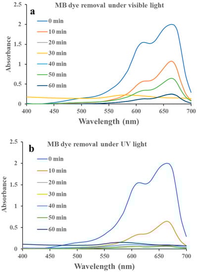 Figure 12b indicates the methylene blue dye removal under UV light. From Figure 12b, it is clear that the highest intensity peak was at 0 min and there was a sudden decrease in the intensity of the peak at 10 min. After 10 min, the intensity of the peak reached much lower indicating the removal of the majority of the MB dye under UV light. The lowest intensity was obtained at 50 min; after which, there was a slight increase in the intensity of MB dye.