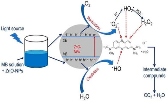 - Modi, S.; Yadav, V.K.; Gacem, A.; Ali, I.H.; Dave, D.; Khan, S.H.; Yadav, K.K.; Rather, S.-U.; Ahn, Y.; Son, C.T.; et al. Recent and Emerging Trends in Remediation of Methylene Blue Dye from Wastewater by Using Zinc Oxide Nanoparticles. Water 2022, 14, 1749. [Google Scholar] [CrossRef]