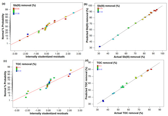 Diagnostic plots, including the plot of predicted value versus actual value and the normal plot of studentized residuals, validate the model predictability, suggesting acceptable approximation of the real system (Figure 1). The normal probability plot in the Sb(III) and TOC removal process is presented in Figure 1a,c, and it generally exhibits a normal distribution with no evident trend and with some expected scattered data points. Moreover, Figure 1b,d indicate good agreement of modeled values with the experimental results, thus validating the robustness of the studied system. In general, these results suggested that experimental data points can be estimated with high accuracy using the quadratic model.