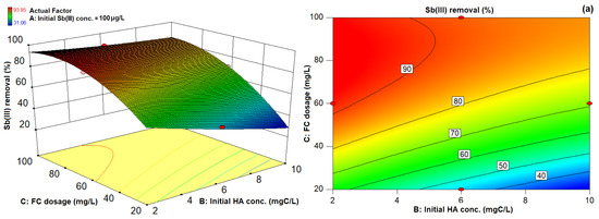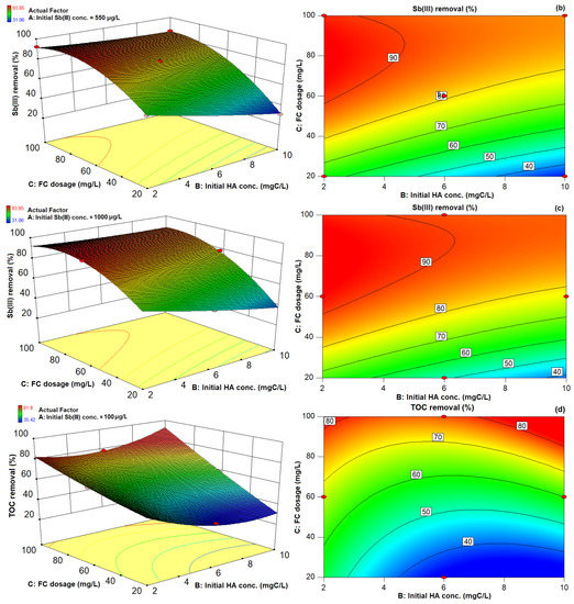 The 3D response surface plots display the function of any two independent variables on removal responses while keeping other variables fixed at desired levels, thus indicating the main and interactive effects of the two studied factors. Similarly, 2D contour plots can indicate the effect of variables on the removal response. Therefore, 3D response surface plots and 2D contour maps of Sb(III) and TOC removal using quadratic model were generated (Figure 2). As indicated in Table 4, initial HA concentration (B) and FC dosage (C) with the highest F value are observed as one of the most influential parameters in both the Sb(III) and TOC removal process. Therefore, both initial HA concentration and FC dosage were used to demonstrate model output with a third variable, initial Sb(III) concentration held at 100 µg/L, 550 µg/L, and 1000 µg/L, respectively.