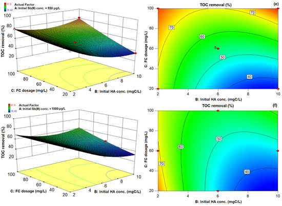 The TOC removal responses as a function of HA and FC dosage at three initial Sb(III) concentration levels is shown in Figure 2d–f. At 100 µg/L Sb(III) level, Figure 2d shows the HA removal response. At a low initial HA concentration of 2 mgC/L, FC dosages of 20 mg/L and 100 mg/L achieve 54.5% and 80.9% TOC removal. However, at 10 mgC/L HA, 35.42% and 81.8% TOC removal was achieved at FC dosages of 20 mg/L and 100 mg/L, respectively. These results suggest that FC dosage is the most significant parameter at a low initial HA concentration. However, the addition of more FC coagulant at higher initial HA levels has insignificant impact on the TOC removal response. These results are consistent with previous research [28], which found an insignificant increase in TOC removal performance after optimum conditions with an increasing FC dosage for highly HA-contaminated suspensions. Similarly, the BBD removal response function of TOC also indicated that the quadratic term (FC dosage × FC dosage) is counterproductive and thus will not improve the TOC removal process (Table 4). Such observation is in good agreement with the previous literature, which reported that increasing the coagulant dosage beyond optimal removal range was ineffective in improving dissolved organic carbon removal from water [30,32]. Moreover, increasing the initial Sb(III) concentration levels, i.e., 550 µg/L and 1000 µg/L, hinders the TOC removal process at high FC dosages up to 75% and 60%, respectively (Figure 2e,f), thus indicating the competing role of Sb(III) ions with HA molecules during the coagulation process [18,24,25,28]. In general, our findings indicate the interactive behavior between Sb(III) and HA molecules, and their influence on simultaneous Sb(III) and TOC removal responses, with the aim of providing remarkable outcomes for large scale conventional water treatment plants.