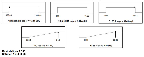 To optimize the FC coagulation process using BBD statistical design, it is necessary to examine the response functions, to evaluate the factors by fitting them in the statistical model that fits the experimental data precisely, to predict and compare the response values of the fitted model with the experimental results, and to confirm the model’s adequacy [38]. Therefore, we have discussed the applicability of developed models in previous sections. In order to identify optimum removal responses for simultaneous Sb(III) and TOC removal, the values of independent variables, including initial HA Sb(III) concentration, initial HA concentration, and FC dosages, were kept in the levels’ range, and Sb(III) and TOC removal responses were set as maximize. The model suggested several experimental conditions for effective removal of TOC and Sb(III) by FC coagulation. Among them, optimal experimental conditions for maximum simultaneous Sb(III) and TOC removal were selected based on desirability of 1.000 and also presented in Figure 3. It can be noted that the model indicated 112.55 μg/L initial Sb(III) concentration, 2.03 mgC/L initial HA concentration, and 98.48 mg/L FC dosage for 93.85% Sb(III) and 81.8% TOC removal from such water suspension.