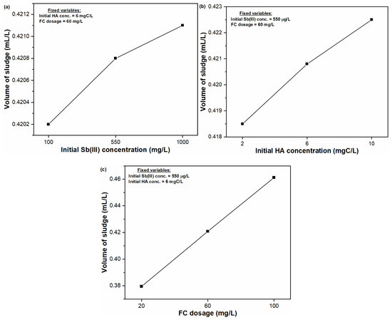 Variation in volume of sludge produced during Sb(III) and TOC removal related to (a) initial Sb(III) concentration (mg/L); (b) initial HA concentration (mg/L) and; (c) FC dosage (mg/L).