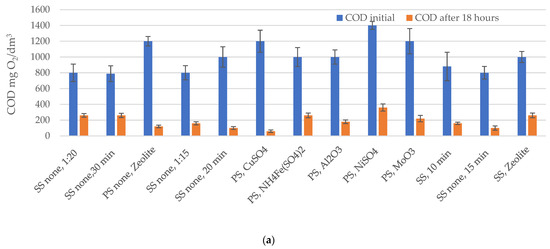 An examination of the wastewater quality revealed very significant fluctuations in the number of organic compounds and the degree of their oxidizability. As a result, COD levels in the analyzed wastewater ranged from 7890 mgO/dm3 to 14,000 mgO/dm3. BOD5 ranged from 5955 to 8137 mgO/dm3 (Figure 1).