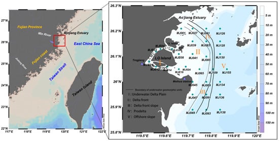 Schematic diagram of MRE area and sampling stations. LQ Island: Langqi Island, CL Island: Culu Island, CSI: Chuanshi Island, CMC: Changmen Channel, MHC: Meihua Channel. The deltaic zonation is modified from Chen et al. (1999) [].