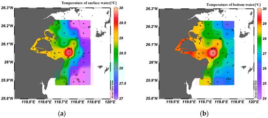 The measured water mass properties during the investigation are illustrated in Figure 2 (the weighted-average method is used to describe spatial variability of all parameters in this article). The temperatures in the surface and bottom water varied spatially between 27.4–29.8 °C and 24.5–29.8 °C, respectively. Generally, the water temperature decreases gradually from the river mouth to the offshore slope (Figure 2a,b). The salinity of the surface and bottom water varied spatially from 0.05–33.55 and 0.55–33.93, respectively, of which the spatial pattern generally increases with distance from the river mouth (Figure 2c,d). The spatial distributions of surface and bottom water turbidity in the MRE varied between 1 and 418 FTU and 5 and 680 FTU, respectively, with higher turbidity near the water channel and the delta front. Notably, the highest turbidity values were located at the extension of the Meihua Channel outlet, which might be associated with the phenomenon of turbidity maximum zone (Figure 2e,f). The spatial distribution of dissolved oxygen (DO%) in both surface and bottom waters varied between 74.1 and 100% and 66.2 and 105.7%, respectively. Low DO saturations were observed in both surface and bottom waters at the channels, while high DO saturations were found in surface water and low DO saturations in bottom water at the north and south of the prodelta and offshore slope (Figure 2g,h). The distribution characteristics of all water properties in the MRE reflect the dispersal of the fresh river effluent to the sea in summer during high temperature, low salinity and high turbidity, which was blocked by the low temperature, high salinity and low turbidity coastal water on the west side of the Taiwan Strait in summer. The river water dispersal was impeded in the delta front of the estuary. The spatial patterns of these water properties seem to suggest the MHC was the dominant outlet for the dispersal of the Minjiang River effluent.