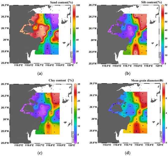 Spatial distribution of surface sediment composition and mean grain size: (a) sand content; (b) silt content; (c) clay content; (d) mean grain size (Ф).