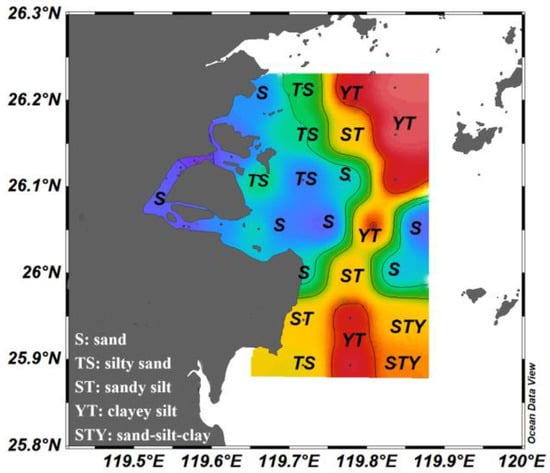 There are five types of surface sediments in MRE. The coarse sand (S) is the most widely distributed, accounting for 45% of the total stations, most of which are distributed in the channel, the shallow sandy shoals at the north of the Meihua station and the offshore shelf area. Secondly, the clayey silt (YT) type accounts for 22% of the total stations and is distributed in the prodelta at the northeast and middle of the study area. Then silty sand (TS) and sandy silt (ST) type account for 16% and 10% of the total stations, respectively. The type of sand–silt–clay (STY) is relatively small (6%), distributed in the southeast of the study area (Figure 4).