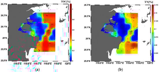 The TOC content (TOC%) in the surface sediments of MRE varied spatially between 0.04 to 1.00%, with an average of 0.45%. The TN content (TN%) varied spatially between 0 and 0.14%, with an average value of 0.06% and the spatial patterns of the two are closely associated (Figure 5a,b). The content of TOC and TN is lower in channel, delta front and offshore shelf sandy sediment area, while high content of TOC and TN is observed in a “narrow muddy belt” located in the prodelta region, which has a similar distribution as the mean grain size of the sediment (Figure 3d). In other words, the content of TOC and TN was higher in the area with fine grained deposits and low in the area with coarse grained depositions. However, it is worth noting that the TOC and TN content at the outlet of the Meihua Channel, where sediment was predominantly composed of sandy particles, is significantly higher than those at the surrounding stations. Therefore, high TOC and TN contents in this area might reflect another OM accumulation mechanism at the MRE which is not associated with preservation regulated by the particle affinity of OM.