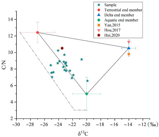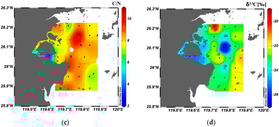 The bulk C/N values found in the surface sediments of MRE (ranging from 2.9 to 10.2) overlap with the expected values from the mixture of marine phytoplankton (C/N = 5–9) []. Delta OM was originated from the 0–5 cm sediment of Shanyutan and Bianfuzhou wetlands at Meihua Channel of MRE (C/N = 8.76–9.82) [] and fluvial particulate OM exported by Minjiang River downstream (C/N = 9.42–12.17, avg. 11.28) []. In this study, the C/N values of stations at MJE12 and MJE14 were lower than six, while the C/N values of most other stations ranged between seven and ten (Figure 5c). These values are slightly lower than those reported in previous studies. The results indicate that both terrigenous and marine sources significantly contributed to the surface OM in the study area.