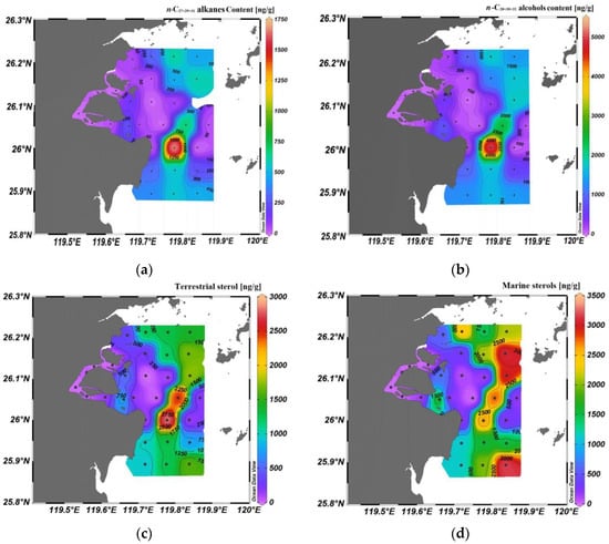 Spatial distributions of (a) n-C27+29+31 alkanes, (b) n-C28+30+32 alcohols, (c) terrestrial sterols and (d) marine sterols in surface sediments of MRE.