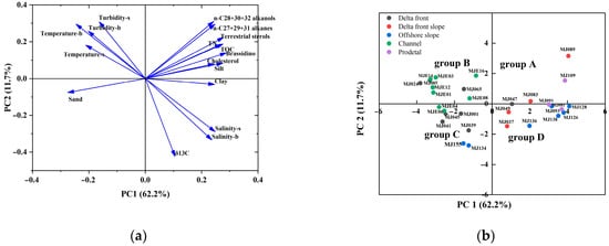 The spatial distributions of TOC, TN and source-specific biomarkers in surface sediments of MRE (Figure 5a,b and Figure 6a–d) reveal that molecular compounds of different sources share similar characteristics. Specifically, the contents of all organic components were generally lower in coarse-grained sandy sediments but higher in fine-grained clayey sediments. The principal component load matrix obtained from PCA can reflect the correlation between individual indices and principal components. A higher absolute value of the load matrix coefficient indicates a stronger correlation between the principal component and the individual index. For PCA analysis, the dataset contained a total of 17 variables including bulk OM properties (TOC%, TN% and bulk OC δ13C), source-specific biomarkers contents, environmental physical parameters and co-ordinate information (Figure 7a). In general, two principal components (PC 1 and 2) are responsible for 73.9% of the total variance in the data. PC 1 accounted for 62.2% of the total variance with high positive loadings of the content of TOC, TN, marine phytoplankton derived sterols (dinosterol + brassicasterol), terrestrial sterols and fine-particle related parameters (clay and silt). Coarse-particle related parameter (the sand content) is negatively loaded on PC 1. PC 2 only accounts for 11.7% of the total variance, with high positive loadings of terrestrial n-alkyl biomarkers content (n-C27+29+31 alkanes and n-C28+30+32 alkanols) and hydrological parameters such as water temperature and turbidity. Bulk OC δ13C values and salinity are negatively loaded on PC 2 (Figure 7a). According to the PCA load matrix, PC 1 clearly represents a dominant controlling factor of surface chemistry related to the particle affinity effect on patterns of the sedimentary OM distribution regardless of OM sources. PC 2 is more likely to reflect the effect of land–source supply, characterized by higher terrestrial compounds contribution, water temperature and turbidity but low salinity of river plume output signal with enhanced impact of PC 2.