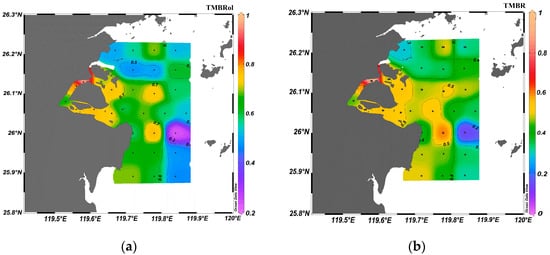 Spatial distributions of (a) TMBRol and (b) TMBR value in surface sediments of MRE.