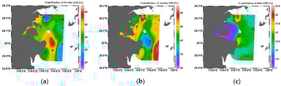 Spatial distributions of contribution of (a) riverine OM, (b) marine OM and (c) delta derived OM in surface sediments of MRE.