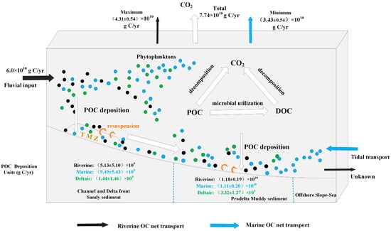 The carbon cycle in the MRE and the deposition of organic carbon in different sedimentary zones of the subaqueous delta are depicted in Figure 11. Previous investigations have shown that the flux of riverine POC input from rivers into the MRE is 6.0 × 1010 g C yr−1 []. Additionally, there is a net release flux of 7.74 × 1010 g C yr−1 to the atmosphere through sea–air CO2 exchange in the MRE region []. The riverine POC undergoes a range of biogeochemical processes, including microbial utilization and organic matter decomposition [,,,], as well as physicochemical processes such as adsorption, desorption, dissolution and settling [,,] when it enters the complex estuarine environment. Our assessment indicates only approximately 28% of the POC from fluvial input is deposited in the estuary ((1.69 ± 0.54) × 1010 g C yr−1), with the majority being found in the prodelta muddy sediment (Figure 11). The missing POC can be either suspended in the water or converted into dissolved organic carbon (DOC) or CO2 through microbial utilization, which can either be stored permanently as recalcitrant DOC or released into the atmosphere or transported laterally to the sea. The organic carbon formed in the adjacent marginal sea can be transported to the estuary by tides, where it plays a crucial role in the carbon cycle through biological or physical pumps. Our estimation suggests that the amount of marine organic carbon deposited in the MRE is comparable to that of riverine deposited POC with (1.69 ± 0.54) × 1010 g C yr−1 of the riverine source and (2.06 ± 0.54) × 1010 g C yr−1 of the marine source, respectively. In a hypothetical extreme scenario where all POC input from the river, excluding the amount deposited in the estuary, is released into the atmosphere as CO2 at the sea–air interface without any other retention and conversion in the aquatic environment or transportation to the sea. As a CO2 source, the MRE releases maximum (4.31 ± 0.54) × 1010 g C yr−1 of terrestrial OM degraded CO2 and at least (3.43 ± 0.54) × 1010 g C yr−1 of marine sourced OM degraded CO2 into the atmosphere. Therefore, it is inferred that only a small percentage (approximately 30% of riverine organic carbon) is deposited in such tidal estuaries. Most organic carbon will either decompose or remain suspended in the aquatic environment, participating in various biochemical or physical processes.