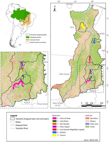 Brazilian hydropower systems are characterized by large water reservoirs with multiyear regulation capabilities, and they are often arranged in cascades [1]. Hydropower plants are responsible for 65% of the electricity generation in Brazil; this is about four times higher than the percentage of electricity generation that hydropower plants are responsible for worldwide (16%) [2,3]. In 2020, the installed capacity of electricity generation by hydropower plants in Brazil was 104,205 MW; 13% of this capacity (12,992 MW) comes from seven cascade reservoirs located in the Tocantins–Araguaia Basin [3,4]. This basin has a drainage area of 767,000 km2, that includes savannah and tropical rainforest ecosystems that are very ecologically sensitive since they include large and highly biodiverse floodplains [5,6,7]. Nevertheless, this basin has been subject to large-scale degradation, especially over the last 40 years [5].