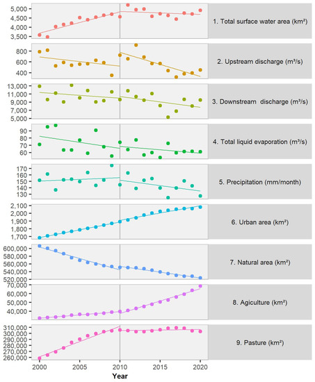 Temporal evolution of the following data from the Tocantins–Araguaia Basin: (1) the sum of the surface water area of hydropower reservoirs, (2) discharge in the most upstream reservoir (Serra da Mesa), (3) discharge in the most downstream reservoir (Tucuruí), (4) sum of all reservoirs’ liquid evaporation, (5) mean annual precipitation, (6) total urban area, (7) total natural vegetation area, (8) total agricultural area, and (9) total pasture lands.