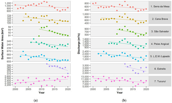This study shows that the construction of new reservoirs led to an increase of 37.7% in the total water surface area of the reservoirs located in the Tocantins–Araguaia Basin during the period from 2000 to 2020. However, there is a significant decreasing trend in the surface area for most of the studied reservoirs when they are considered individually, except for the Tucuruí and Serra da Mesa reservoirs, which showed no significant surface area trend for the entire 20-year period. Tucuruí is the only reservoir that does not seem to have a decreasing area, especially after 2010. Serra da Mesa, on the other hand, from 2010 to 2020, presented a significantly decreasing trend in the surface water area. The annual average discharge shows an apparent decrease for all the reservoirs, even though this decrease is only statistically significant for the São Salvador, Peixe Angical, Lajeado, and Tucuruí reservoirs. All reservoirs showed significant decreasing patterns between 2010 and 2020.