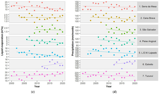 Liquid evaporation data are also available in ANA’s metadata catalog [41]; a spreadsheet with the liquid evaporation data of artificial reservoirs with a mapped area larger than 1 km2 for the years 2001 to 2019 is available [46]. The liquid evaporation (m3 s−1) is given by the difference between the real evaporation of the water reservoir and the expected evapotranspiration in the same area if the artificial reservoir did not exist [46]. The estimates included in the database are based mainly on the physical principles of mass and heat transfer equations and the energy balance, which are included in a system developed specifically for liquid evaporation estimates known as the Lake Evaporation System Based on Surface Temperature (SELET); this system has a minimum level of sensitivity of 0.5 m3 s−1 [46]. In the data analysis for the entire Tocantins–Araguaia Basin, the sum of the liquid evaporation of all reservoirs was considered.