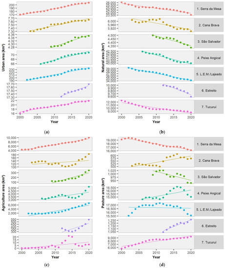 Temporal changes in the areas of the reservoir’s individual watersheds for the following LULC parameters: (a) urban area, (b) natural area, (c) agricultural area, and (d) pasture area.