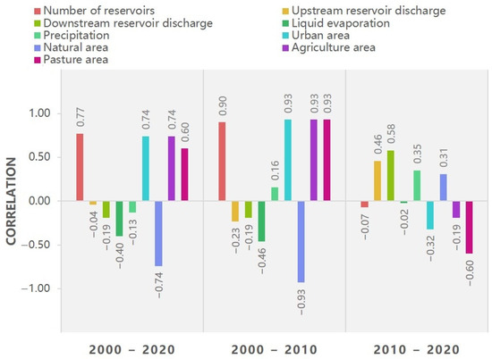For the first decade (2000–2010), only the LULC parameters and the number of reservoirs showed statistically significant correlations with the total area of the reservoirs (Table S7). These parameters show the highest correlations with the surface area (Figure 5). This was expected because the construction of a new reservoir makes a major contribution to the sum of the total area of the reservoirs. Considering the period from 2000 to 2010, the lowest correlation was found for precipitation, while the land-use-related classes were correlated positively with the total surface water area. Surprisingly, the area occupied by natural vegetation presented a high negative correlation. However, in the first decade, the area occupied by natural vegetation is converted not only into urban and farming areas but also into new artificial reservoirs, which explains this negative correlation. In the second decade, there was an inversion of the correlation between the surface water area and LULC parameters. In this period, the construction of dams decreased, causing the surface water area in the watershed to decrease as the land use increased.