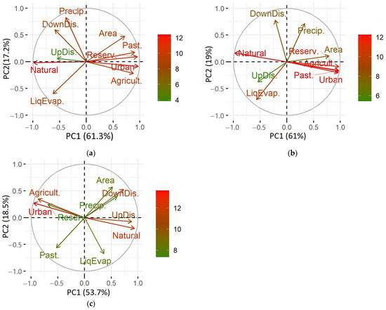 Biplot of the first principal component (PC1) vs. the second principal component (PC2) for the Tocantins–Araguaia Basin for (a) 2000–2020, (b) 2000–2010, and (c) 2010–2020. The variables are classified with a color palette according to their total contributions to the two principal component dimensions. Area: total surface water area; UpDis: upstream reservoir discharge; DownDis: downstream reservoir discharge; LiqEvap: liquid evaporation; Precip: precipitation; Urban: urban area; Agricult: agriculture area; and Past: pasture area.