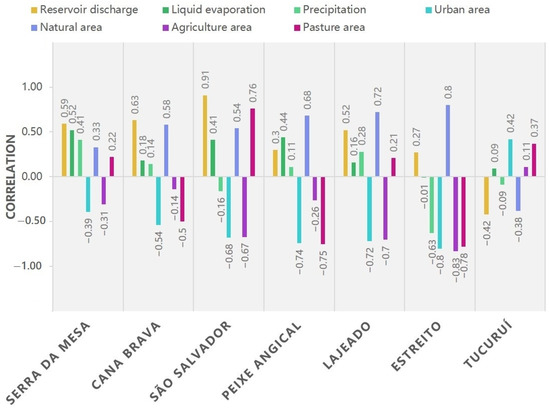 Although the PCA (Figure 8) corroborates the finding that the parameters most often associated with reservoir areas are the LULC parameters and the discharge, there is new important information to be added. For all reservoirs, except for the Estreito reservoir (Figure 8f), the liquid evaporation is one of the factors most closely associated with the reservoir areas. In the Estreito reservoir, the most important parameter is the natural vegetation, even though other LULC parameters and the precipitation also present relatively high correlations. Associations with natural vegetation areas can also be seen in Cana Brava, São Salvador, Peixe Angical, and Lajeado. In the case of the Tucuruí reservoir, even though the liquid evaporation has a correlation lower than those of the other parameters and no statistically significant correlation, the main observed association of the reservoir area is its association with the liquid evaporation.