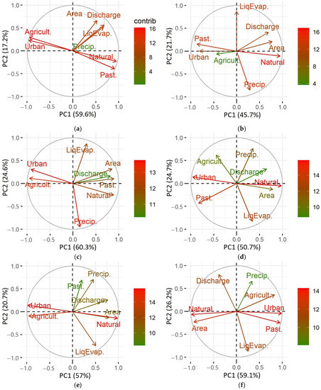 Figure 6a,b show that the PCA corroborates the results discussed above. The number of reservoirs, the sum of the reservoir areas, and the LULC parameters were clustered together in both periods. One major difference is that in the period from 2000 to 2010, these parameters are close to each other, but they are not in the same quadrant as the total surface area (Figure 5b). The LULC parameters and the number of reservoirs also represent the highest contributions to the first two components (Figure 5a,b). Therefore, changes in the LULC data and the increasing number of reservoirs appear to be more closely associated with the total surface water area during the period from 2000 to 2010.