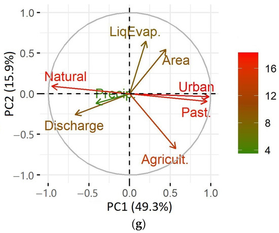 Biplot of the first dimension vs. the second dimension of the principal component analysis of the following reservoirs: (a) Serra da Mesa, (b) Cana Brava, (c) São Salvador, (d) Peixe Angical, (e) Lajeado, (f) Estreito, and (g) Tucuruí. Highly correlated parameters were omitted. In this case, only the parameter with the highest correlation with the reservoir area was represented. The time period varies for each reservoir and corresponds to the beginning of the monitoring of each reservoir to 2020.