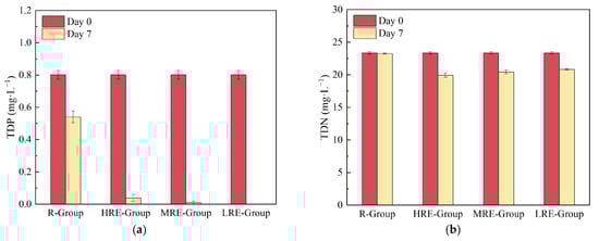 After the culture, compared with the control group R-Group, the concentrations of TDP and TDN in the three co-culture groups decreased significantly (p < 0.01), and the concentration of TDP was close to 0 mg/L (Figure 4a,b). The presence of E. crassipes accelerated phosphorus consumption in the water.