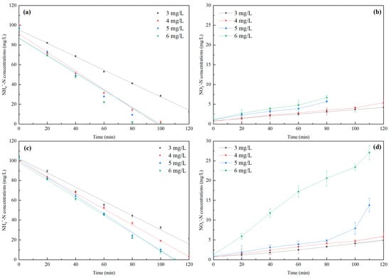 Performance of partial nitrification at different DO levels in synthetic wastewater: NH4+-N concentration changes in the E1-immobilized carrier (a) and the E2-immobilized carrier (c); NO3−-N concentration changes in the E1-immobilized carrier (b) and E2-immobilized carrier (d).