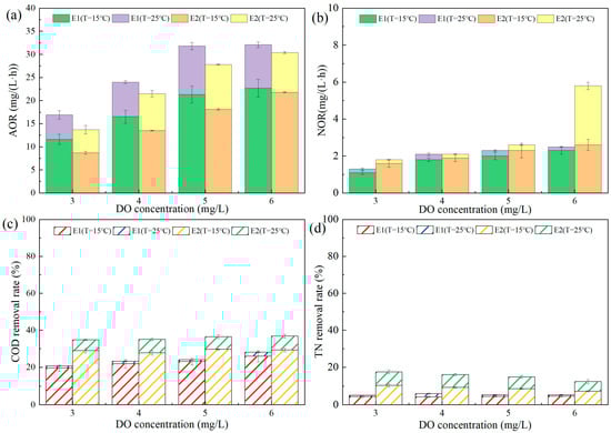 Figure 3a,b show the changes in the ammonia oxidation rate (AOR) and nitrite oxidation rate (NOR) of E1- and E2-immobilized carriers under different DO concentrations in municipal wastewater at 25 and 15 °C. The AOR of the E1- and E2-immobilized carriers at 25 °C was lower in municipal than in simulated wastewater, indicating that the AOB activity in the PN-immobilized carrier was affected by the low ammonia nitrogen and organic matter levels in municipal wastewater. However, when municipal wastewater was used, the AOR of the E1-immobilized carrier was higher than that of the E2-immobilized carrier under different DO conditions, indicating that increasing the AOB abundance of the PN-immobilized carrier could effectively improve PN efficiency. In addition, when the DO concentration of the E2-immobilized carrier was 6 mg/L in municipal wastewater, the environment was no longer oxygen-limited, which resulted in a sudden increase in NOR from 2.6 ± 0.3 to 5.8 ± 0.2 mg/(L·h). When the municipal wastewater temperature was reduced to 15 °C, the AOR levels of the E1- and E2-immobilized carriers were reduced by 31.2 ± 1.5% and 34.2 ± 4.1%, respectively. This indicated that increasing the AOB abundance in the PN-immobilized carrier cannot effectively mitigate the effect of low temperature on AOB activity. However, the NOR of the E2-immobilized carrier increased from 2.3 ± 0.4 to 2.6 ± 0.2 mg/(L·h) when the DO concentration increased from 5 to 6 mg/L when the temperature was reduced to 15 °C. This may be due to the low NOB activity in the PN-immobilized carrier because of the low temperature. Even if the DO concentration was high due to the destruction of the oxygen-limited environment in PN-immobilized carriers, the activity of NOB could not be effectively improved. According to the above phenomenon, the DO concentration of the E1- and E2-immobilized carriers was controlled at 5 mg/L under continuous flow conditions.