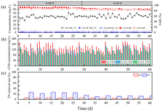 Partial nitrification characteristics and pollutant removal performance of the E1- and E2-immobilized carriers: (a) influent and effluent NH4+-N, NAR; (b) influent and effluent COD; (c) TN removal rate.