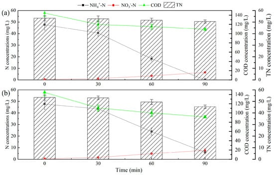 The concentrations of COD, total nitrogen (TN), NH4+-N, NO2−-N, and NO3−-N were analyzed according to the APHA standard methods [25].