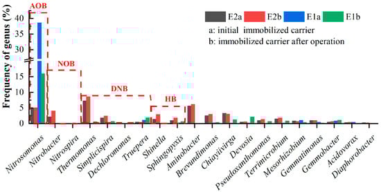To investigate the changes in the microbial community structure in both carriers after the low-temperature shock, the microbial structure at the genus level was examined (Figure 6). Nitrosomonas, affiliated with AOB, is the main genus in municipal wastewater treatment plants, although Nitrospira and Nitrobacter, affiliated with NOB, can also be found [33,34]. After the low-temperature shock, the relative abundance of Nitrosomonas in the E2-immobilized carrier increased from 4.78% to 5.03%, whereas that of Nitrosomonas in the E1-immobilized carrier decreased from 38.59% to 15.91%. The relative abundances of Nitrospira and Nitrobacter in the E2-immobilized carrier increased from below the detection limit and 2.15% to 0.01% and 4.01%, respectively, whereas those of Nitrospira and Nitrobacter in the E1-immobilized carrier decreased from 0.01% and 0.11% to below the detection limit and 0.04%, respectively. Although it is widely believed that the ability of nitrifying bacteria to reproduce is inhibited at low temperatures [35], the above phenomena indicate that PN-immobilized carriers with nitrifying bacteria undergo different changes in bacterial relative abundance after a low-temperature shock. Some studies found that low temperatures do not reduce the NAR of PN reactors [22,23], but, in this study, the low-temperature shock reduced the NAR of the PN carriers. Most likely, this occurred because of a decrease in AOB abundance, which led to a weakened oxygen-limited environment in the E1-immobilized carrier, whereas an increase in NOB abundance led to a higher NOB activity in the E2-immobilized carrier.